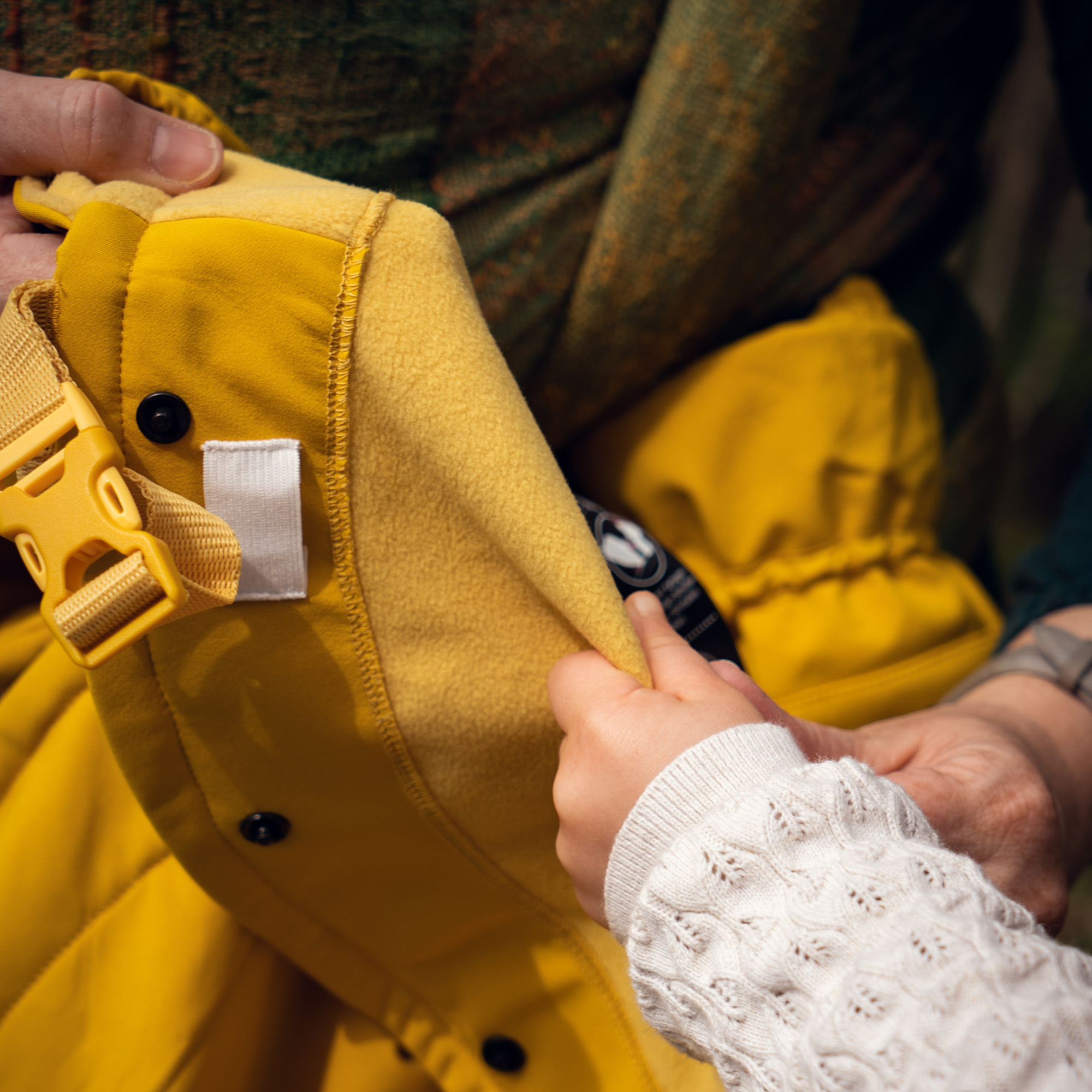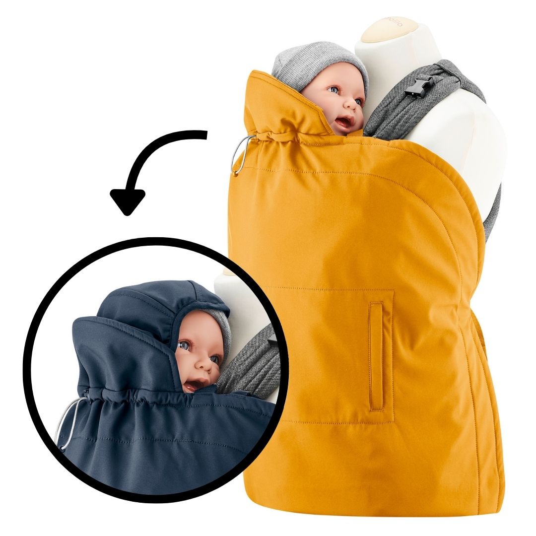Extérieur : tissu en softshell imperméable et coupe-vent, intérieur : polaire douillette pour que bébé reste bien au chaud et au sec ! La poche intégrée et refermable à l’extérieur peut également servir de manchon pour le porteur.