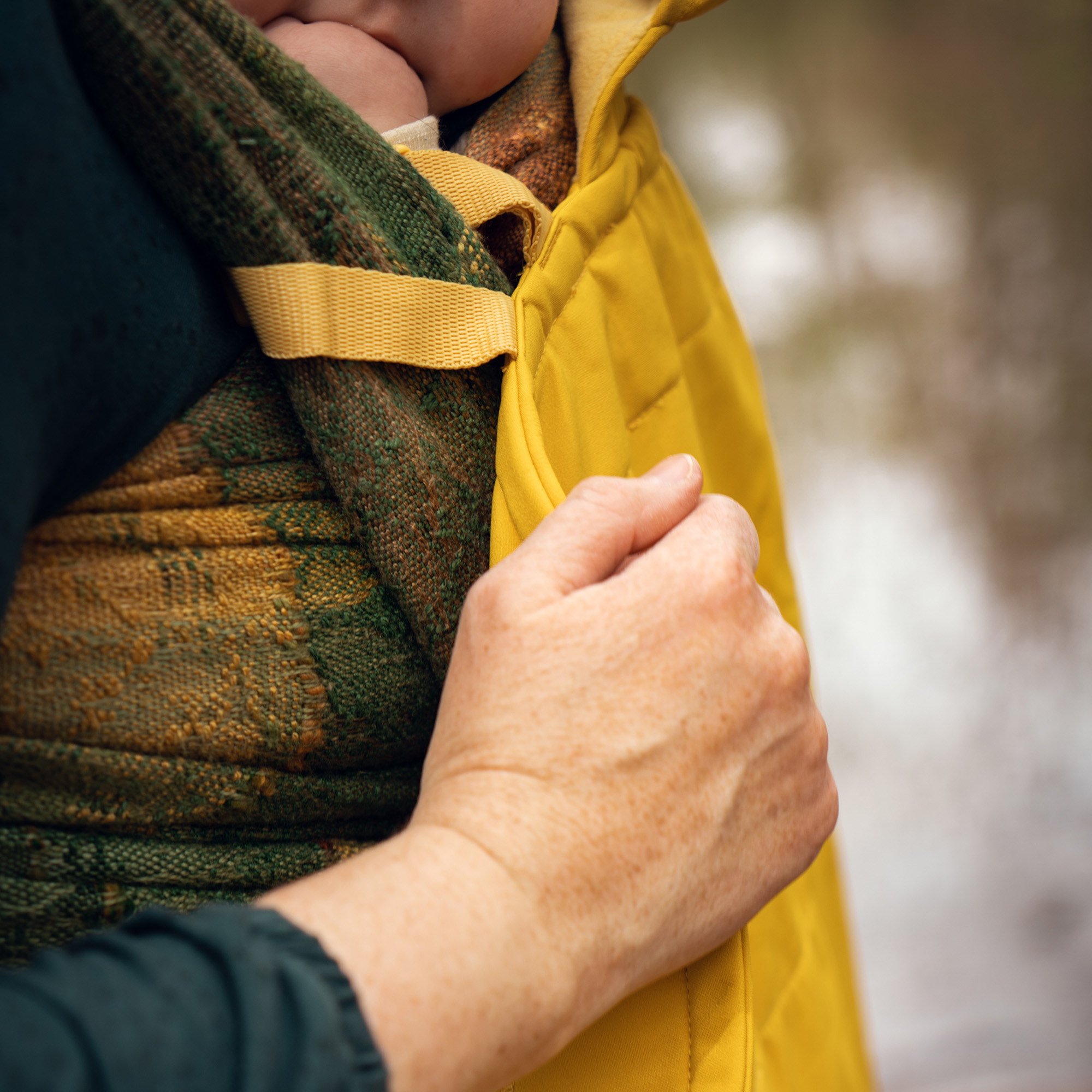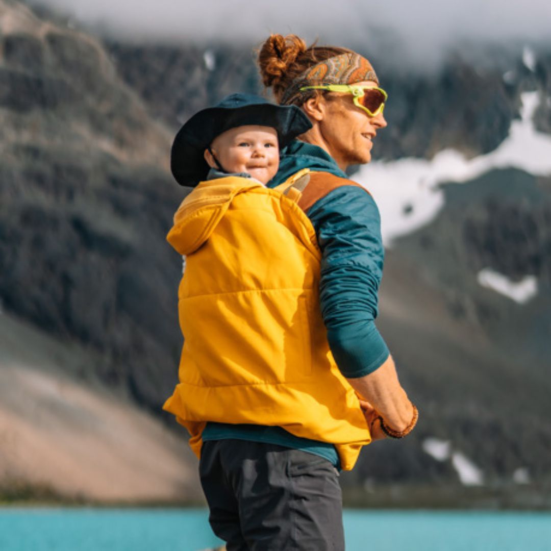 La couverture en softshell se porte aussi bien avec un porte-bébé qu’une écharpe de portage. Utilisez les sangles courtes standards en les clipsant autour des bretelles du porte-bébé, ou bien optez pour les sangles plus longues fournies avec si vous portez en écharpe.