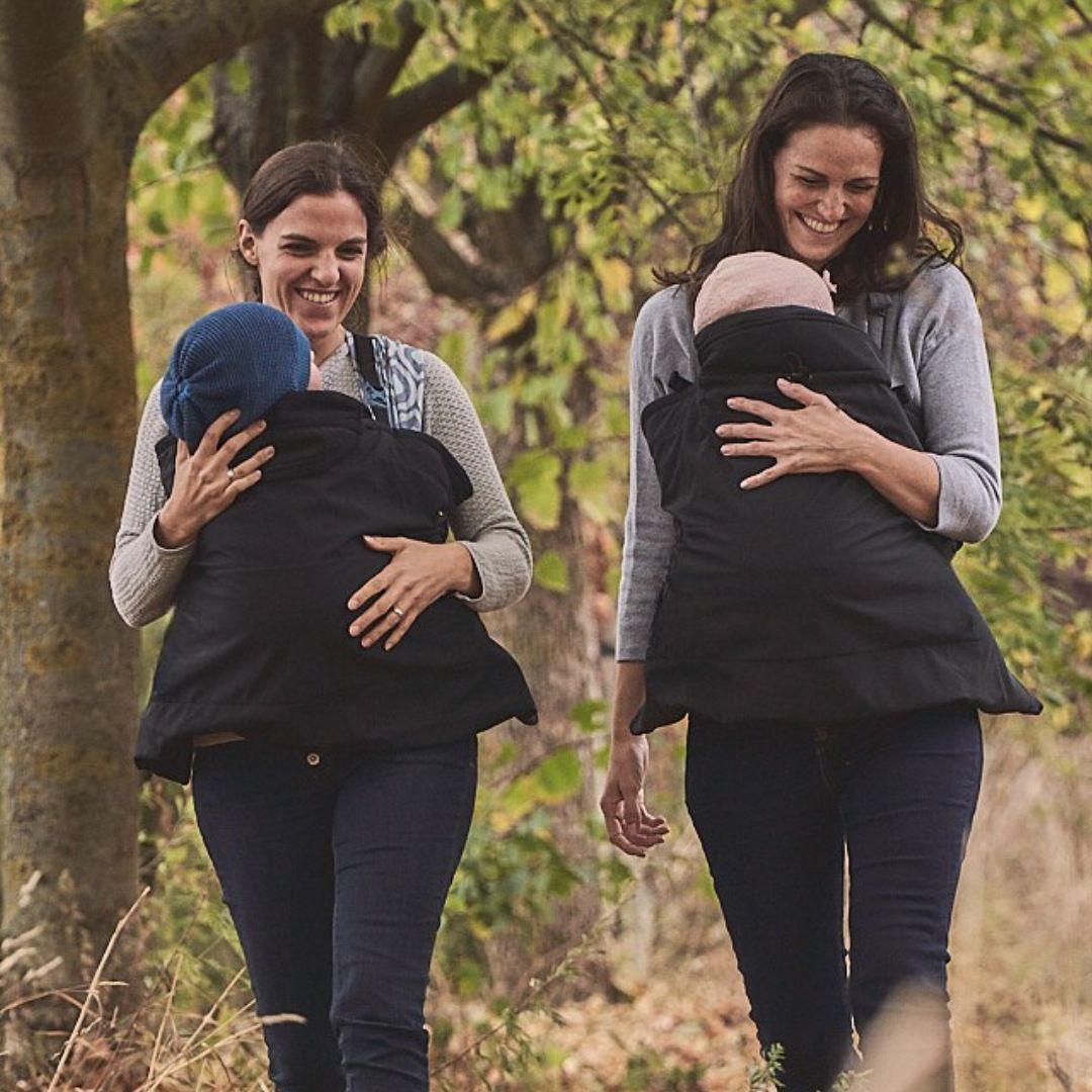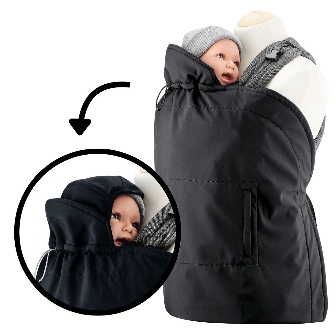 La couverture en softshell se porte aussi bien avec un porte-bébé qu’une écharpe de portage. Utilisez les sangles courtes standards en les clipsant autour des bretelles du porte-bébé, ou bien optez pour les sangles plus longues fournies avec si vous portez en écharpe.