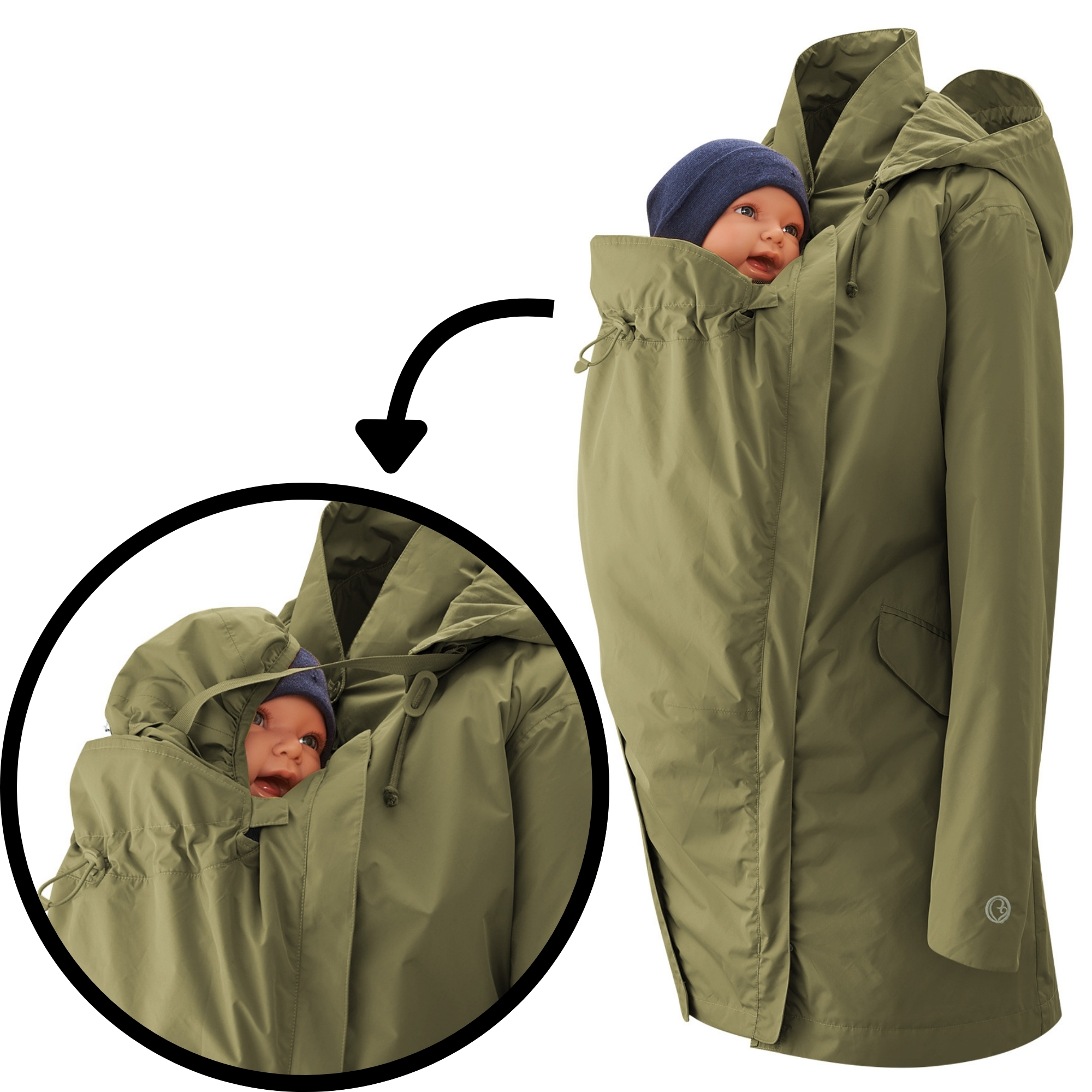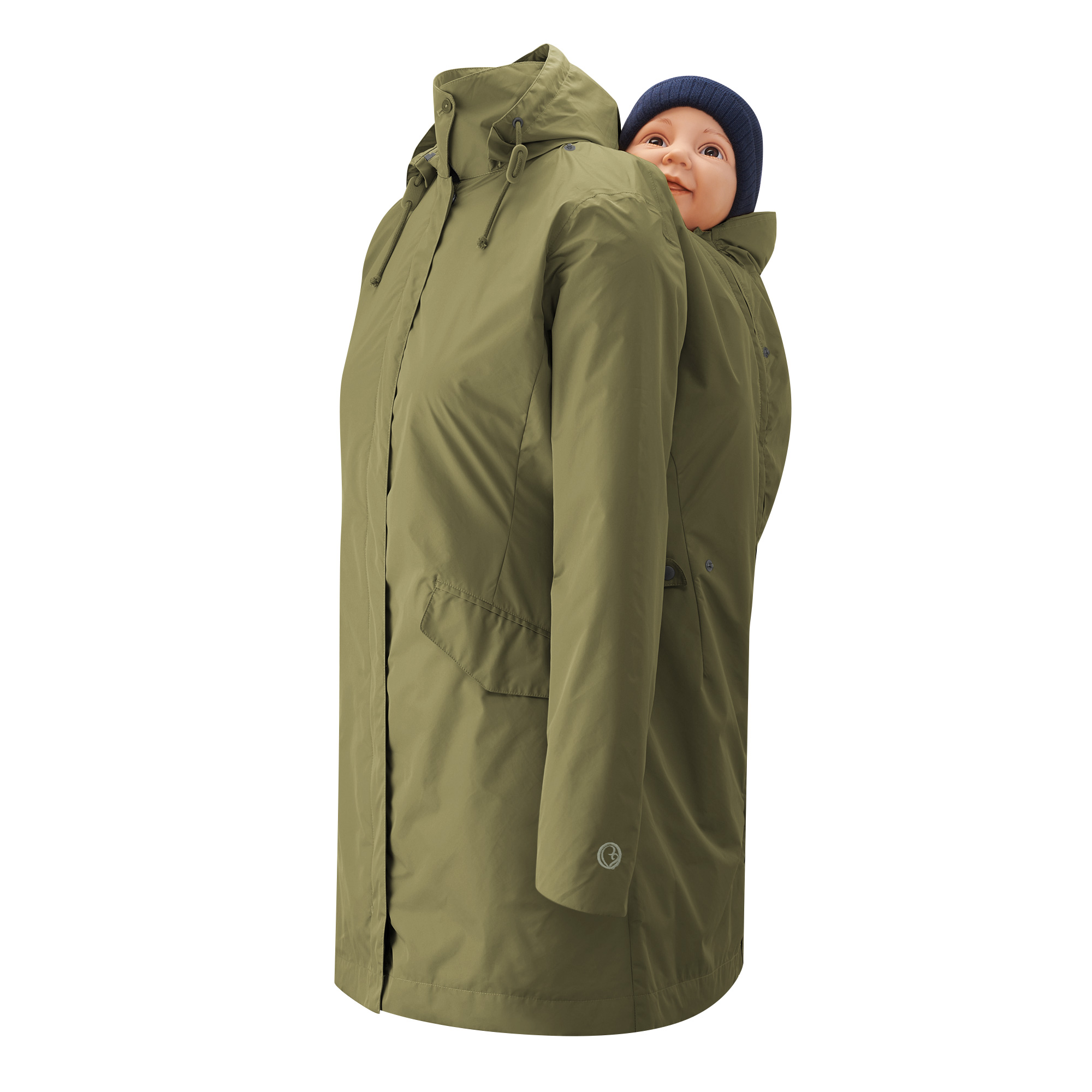 Tiefe Taschen, verstellbare ärmelweite, abnehmbare Kapuze und perfekt passende Schwangerschafts- und Traglingseinsätze für vorne und hinten.
